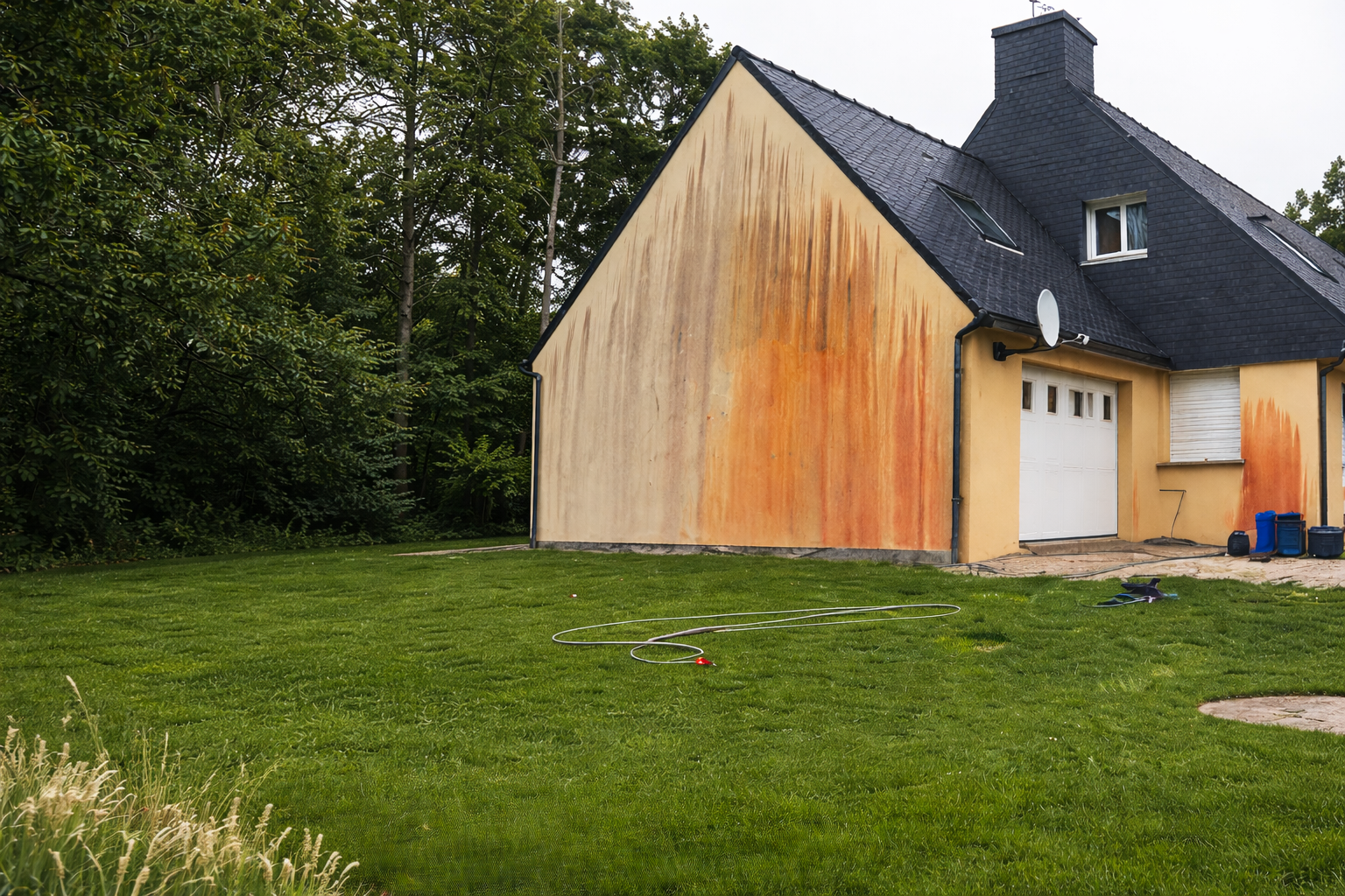 Avec le temps, des traces noires, des mousses ou des lichens peuvent apparaître sur les murs extérieurs. Ces dépôts retiennent l’humidité et peuvent fragiliser les matériaux si aucun entretien n’est réalisé.